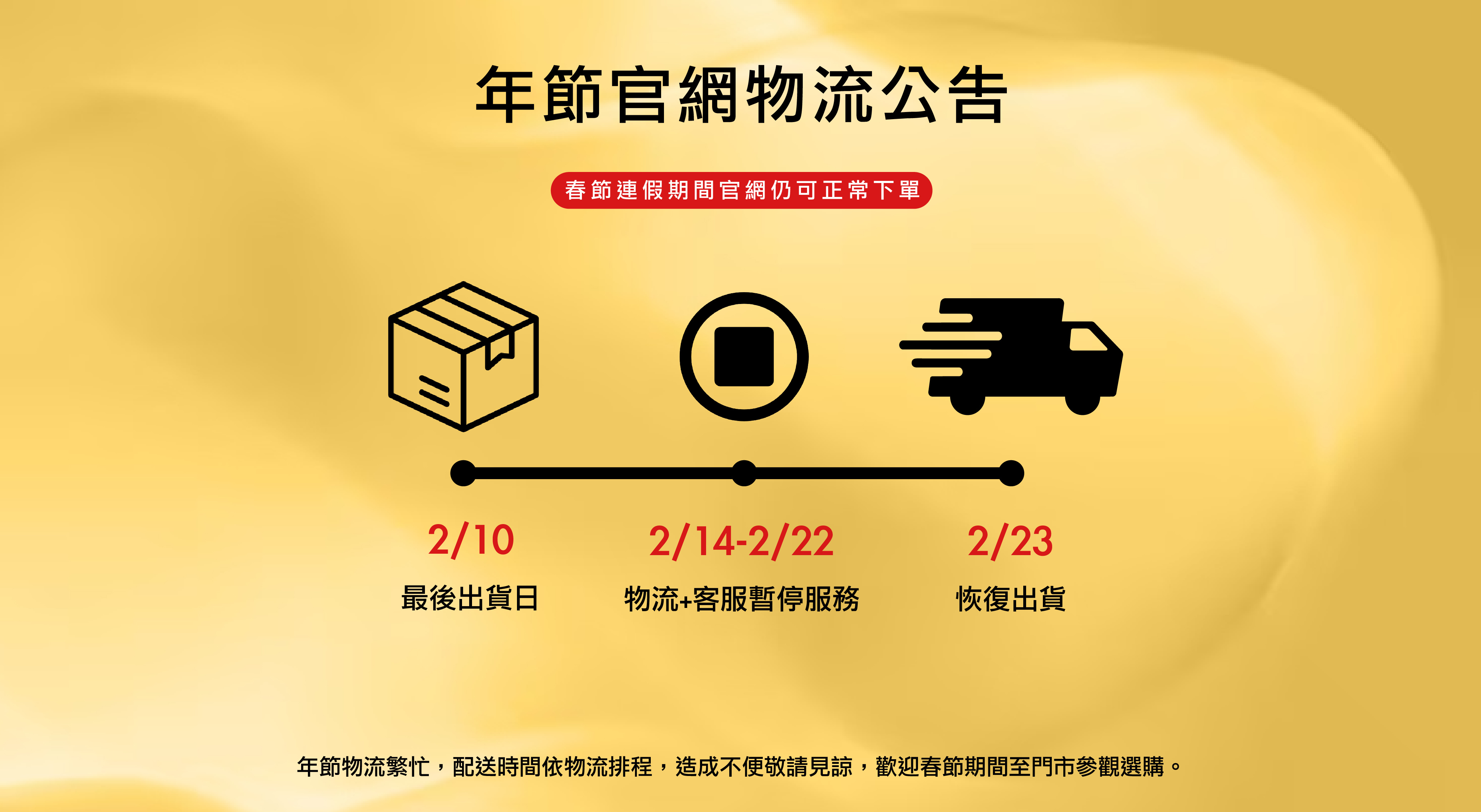 📣2/10最後出貨日,2/23恢復出貨📣年節物流繁忙,配送時間依物流排程,造成不便敬請見諒。